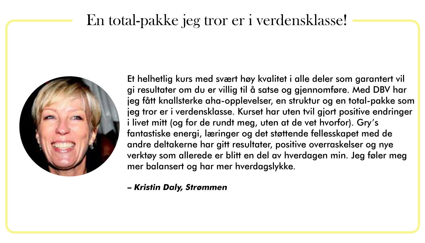 DinBesteVersjon gir deg klarhet i hva du egentlig vil og hjelper deg ta action mot dine mål og drømmer. Du starter med å ta et valg om å gjøre dette til ditt beste år noensinne. Du må være villig til å jobbe, for resultater kommer aldri av seg selv. Men små steg mot dine mål hver dag gjør underverker. Det tar ikke mange ukene før du kanskje sier: “Jeg kan ikke tro hvor gøy jeg har fått det på jobben“. Eller kanskje: “Kjæresten kom tilbake og kysset meg etter å ha gått ut døra i morges – det har han ikke gjort de siste 15 årene vi har vært sammen.” Eller: “Jeg var ofte superstressa på jobb, nå er jeg ajour og kan gå hjem kl 16. Ikke til å tro.“