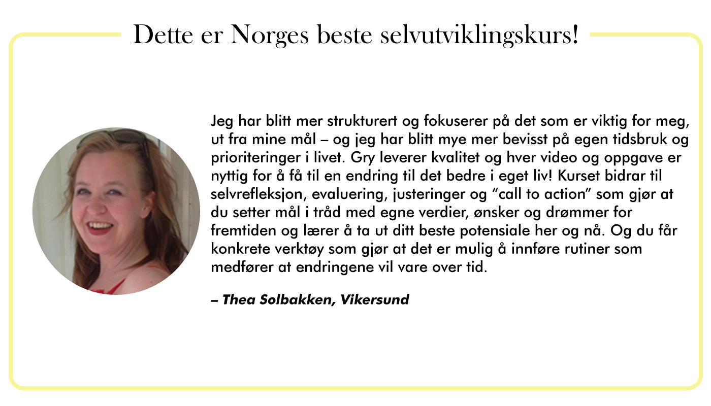 Den gode nyheten er at denne metoden virker! Det er bevist både av tidligere kursdeltakere og gjennom egne resultater. Med alle verktøyene i kurset kan du få i pose og sekk: En jobb du elsker, med tid til å pleie deg selv og med fokus på det som er viktigst for deg – å være med familien og venner og gjøre ting som gir deg energi. Livet er for kort til å gjøre ting du ikke elsker. For kort til å ikke ha det gøy – hver dag. For kort til at du ikke skal føle deg inspirert, glad og ha overskudd i hverdagen. Livet er her og nå. Det er på tide å slå av autopiloten og starte å leve igjen.