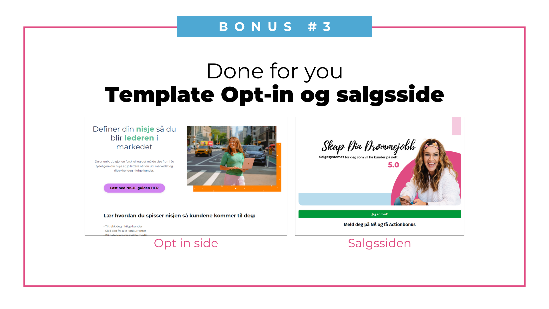Du trenger ikke engang å kopiere og lime inn! Vi har laget en mal som lar deg installere salgssystemet ditt automatisk. Enklere blir det ikke. Spar to hele dager med arbeid med en velprøvd mal som er skreddersydd for det norske markedet. Nå er kundene dine bare et klikk unna. Perfekt for deg som ikke føler deg så teknisk anlagt. Det aller beste; vi har lagt til 3 tekniske timer med vårt tekniske geni slik at du kan få hjelp når du står fast. Fra "fikling" til ferdig salgssystem på 1 uke.